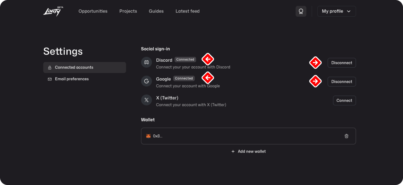 <figure><img src="https://3864456057-files.gitbook.io/~/files/v0/b/gitbook-x-prod.appspot.com/o/spaces%2FMpSvoD7dAtJYlMq6UHFE%2Fuploads%2FFeXZCDGEqFA5BFhiNZ5y%2FGitBook%20Img%206.png?alt=media&#x26;token=838a5033-e0ee-45d1-97ad-a6986b652c4b" alt=""><figcaption><p>The Settings page of a user who has connected Discord, Google and a MetaMask wallet</p></figcaption></figure>