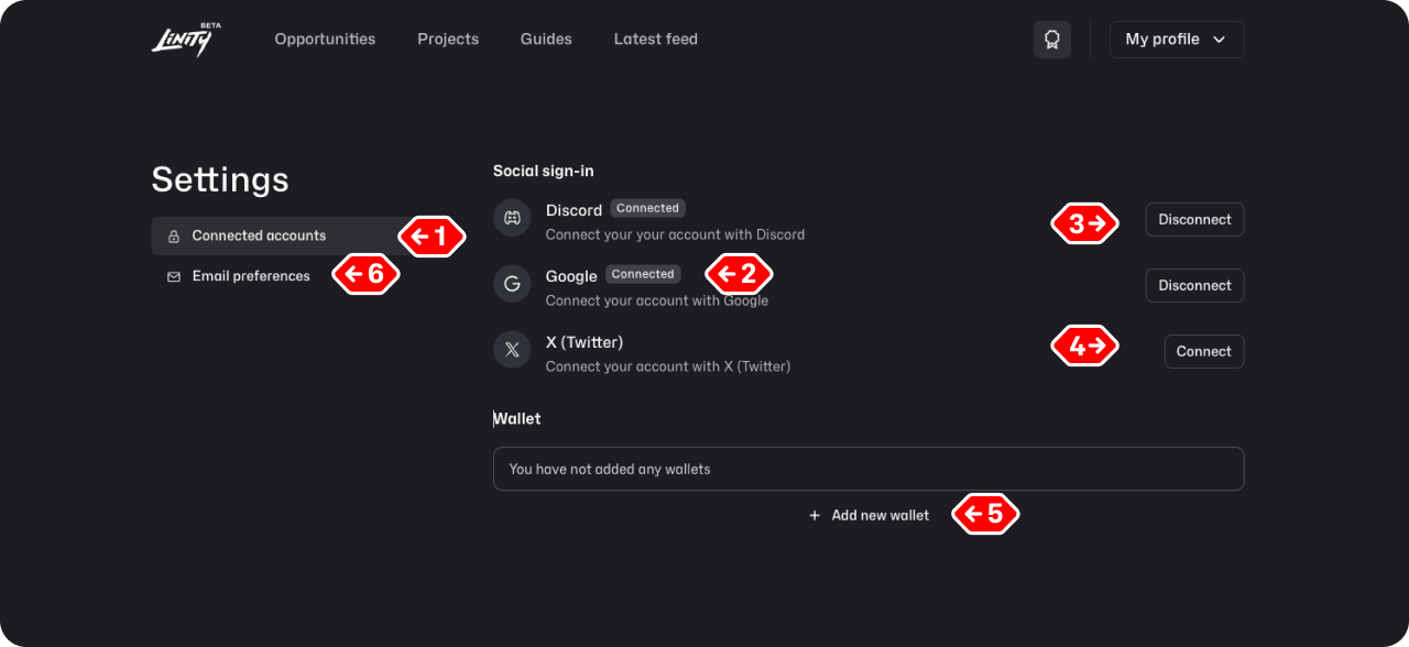 3. **Connect using Discord** - Discord is filled with a lot of community activities, and it is where thousands of Linity users interact and get first hand information about Linity. If you have a Discord account, you can connect it to your Linity profile from here.