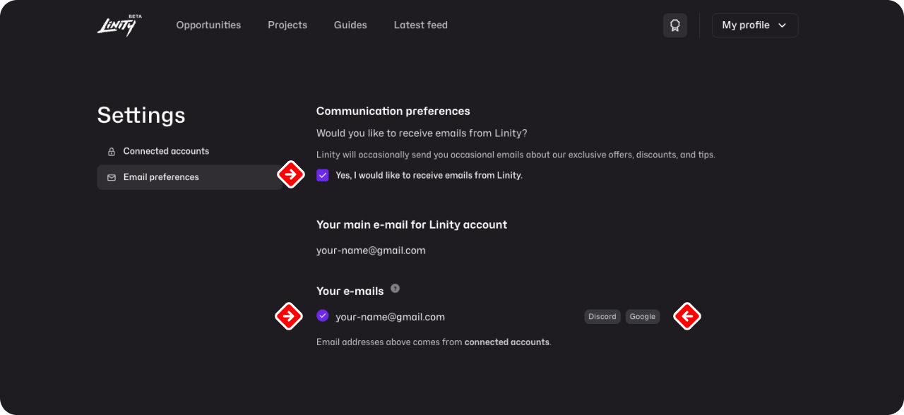 In this subpage, you are able to indicate if you do not wish to receive newsletters from Linity, you can also choose which of the emails belonging to your connected accounts that you wish to receive Linity newsletters on. You simply check or uncheck the options you are comfortable with.